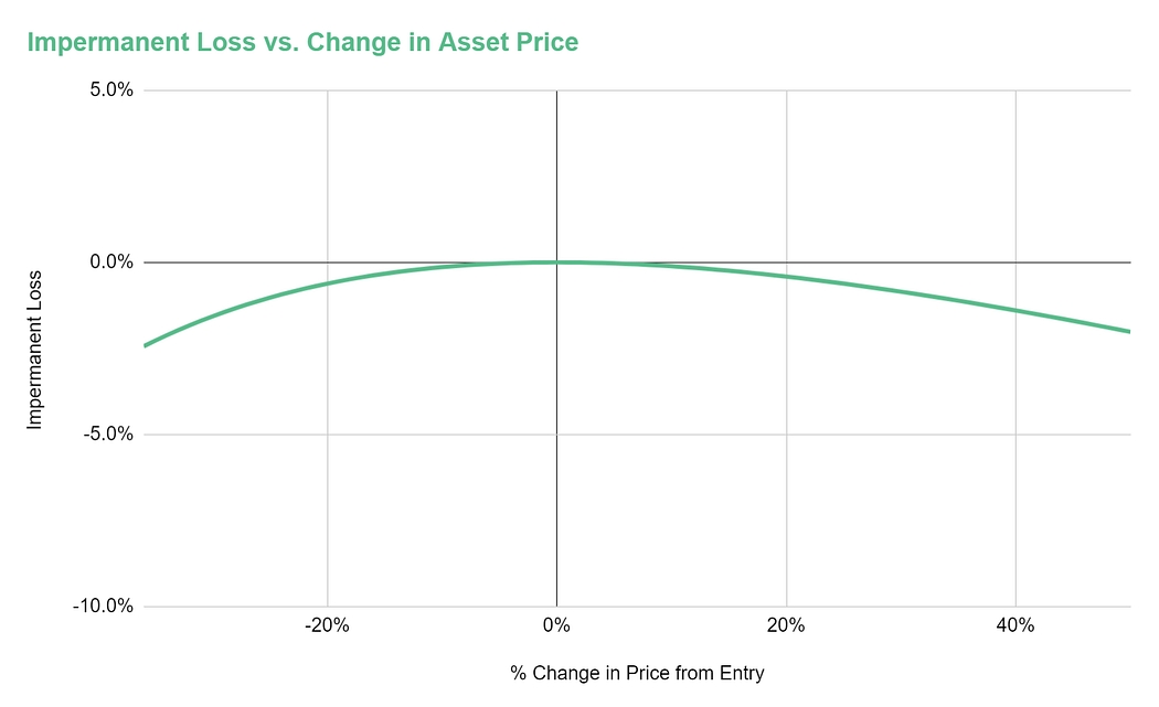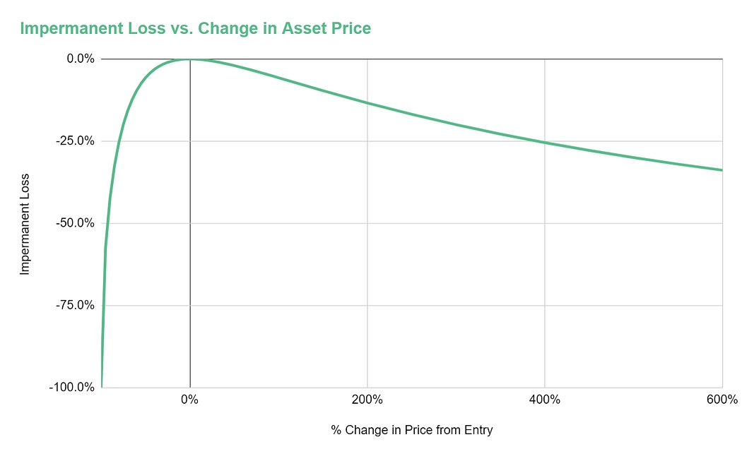 You may have seen a chart like the one below that shows the effect of Impermanent Loss as price moves away from your entry. At first, the chart might seem terrifying, with a steep curve to the left going all the way down to -100%! However, upon closer inspection, we would argue that IL is no different than other types of investment risks where if you have a proper understanding of the risk and a sound game plan, you can mitigate any potential losses and bring this risk well within acceptable boundaries.