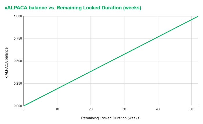 The amount of xALPACA you’ll receive will be calculated based on the amount of ALPACA deposited and the remaining lock duration, where 1 ALPACA locked for one year = 1 xALPACA. Your xALPACA balance will decrease linearly over time and will reach 0 when it’s unlocked.