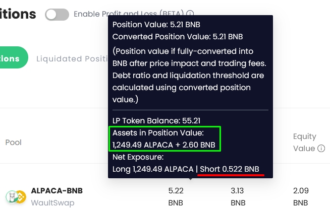 Rastrear sua exposição comprada e vendida ao longo do tempo em protocolos DeFi pode ser bastante complicado. Felizmente, como apontamos antes na seção “Algumas Noções Básicas de Yield Farming Alavancado”, na Alpaca Finance, você pode passar o mouse sobre o “Valor da Posição” da sua posição na página do Portfólio, e o modal aparecerá mostrando em tempo real as exposições compradas e vendidas.